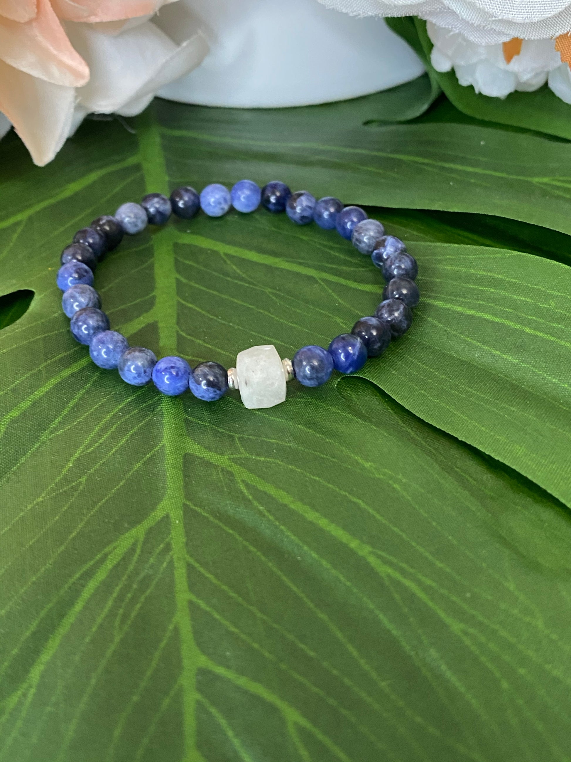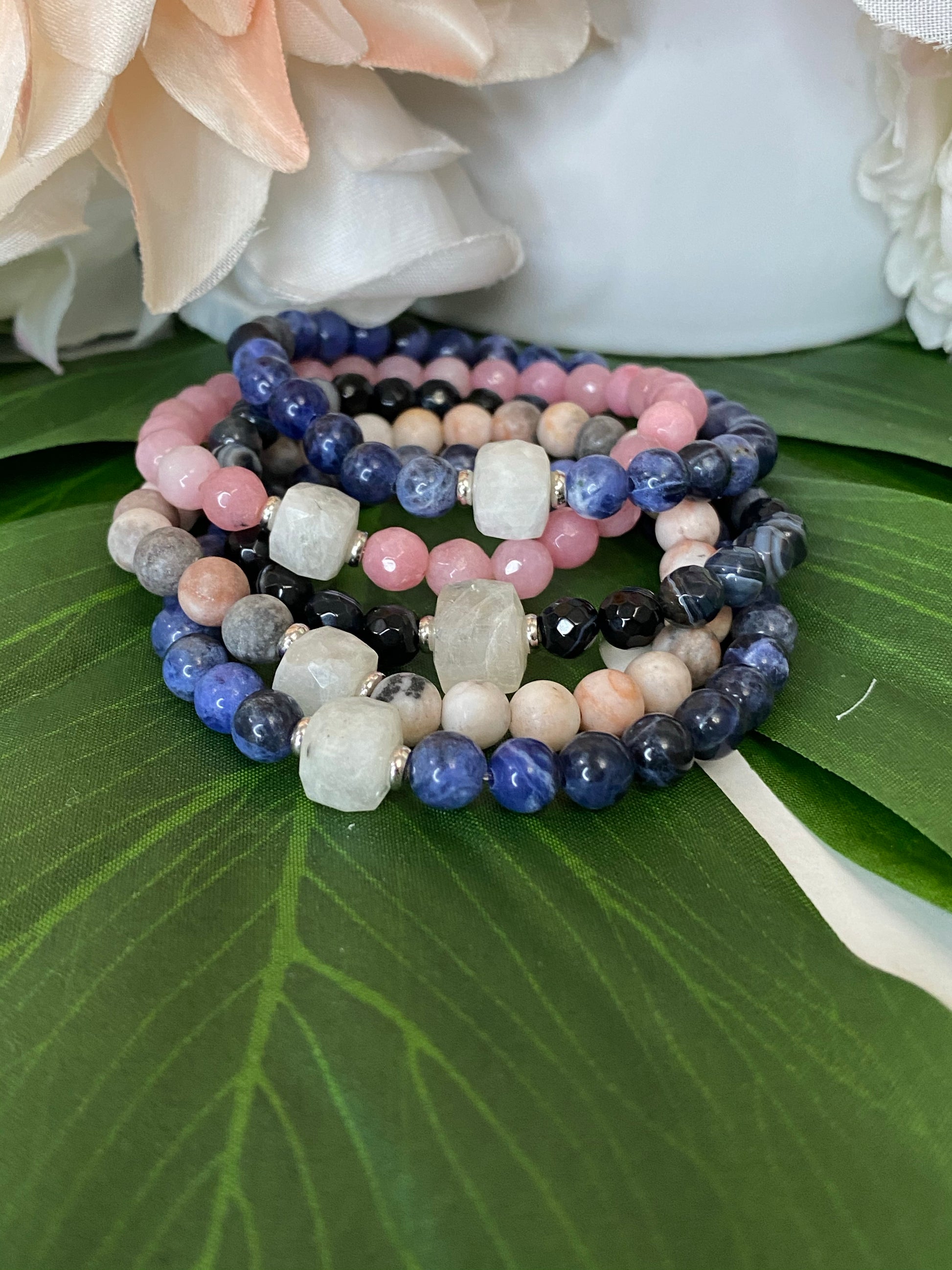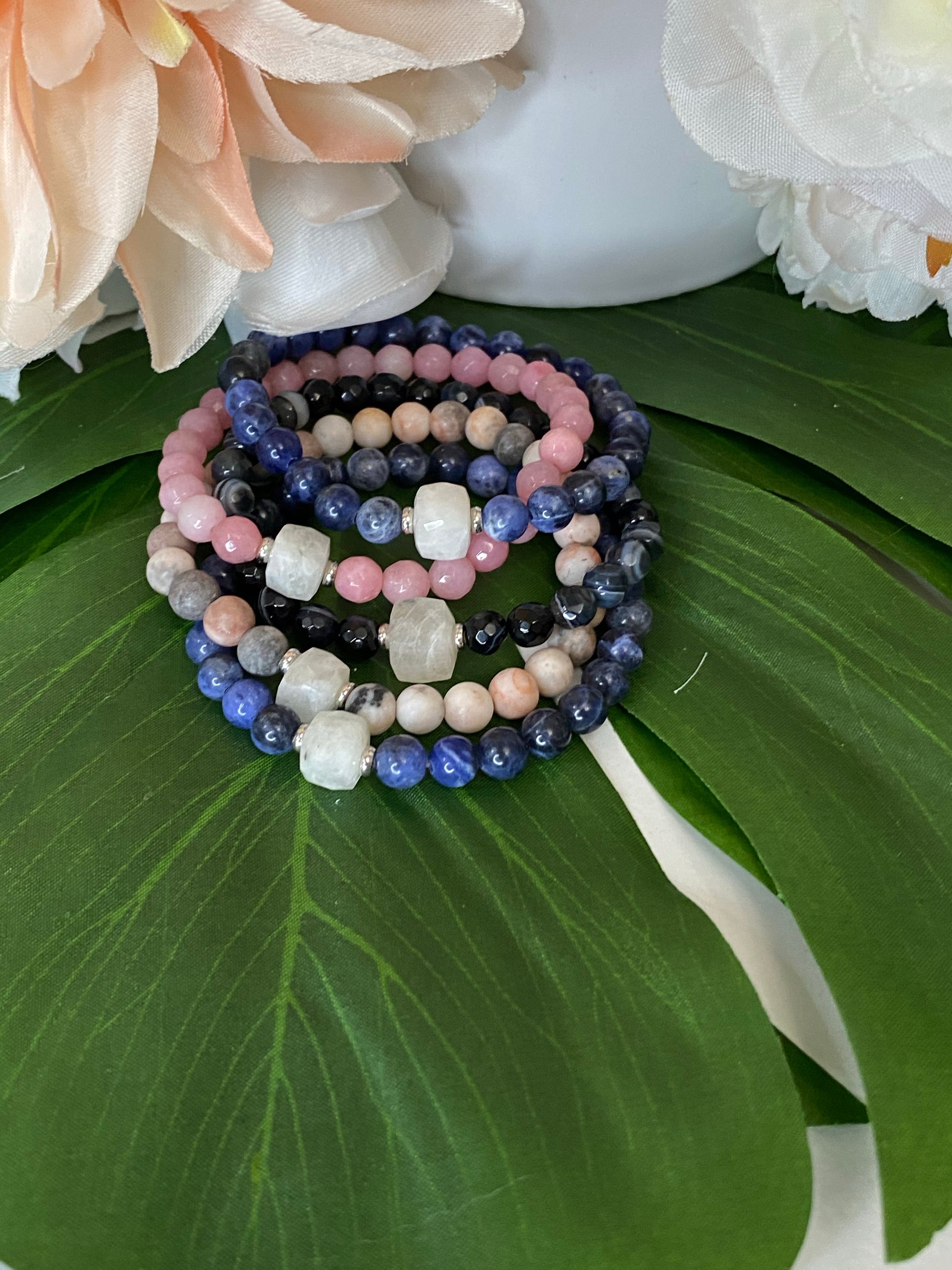 Moonstone faceted cubes accented with 6mm gemstones/crystals.